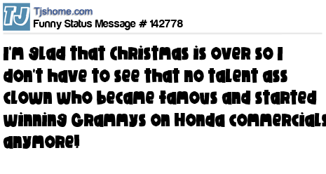 X says I'm glad that Christmas is over so I don't have to see that no talent ass clown who became famous and started winning Grammys on Honda commercials anymore!