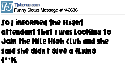 X says So I informed the flight attendant that I was looking to join the Mile High Club and she said she didn't give a flying f**k.