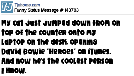 X My cat just jumped down from on top of the counter onto my laptop on the desk, opening David Bowie "Heroes" on iTunes. And now he's the coolest person I know.