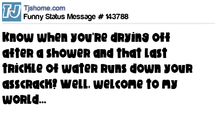 X Know when you're drying off after a shower and that last trickle of water runs down your asscrack? Well, welcome to my world...