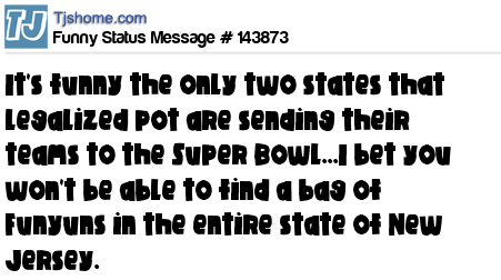 X It's funny the only two states that legalized pot are sending their teams to the Super Bowl...I bet you won't be able to find a bag of Funyuns in the entire state of New Jersey.