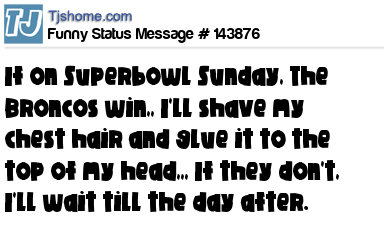 X If on Superbowl Sunday, The Broncos win,, I'll shave my chest hair and glue it to the top of my head,,, If they don't, I'll wait till the day after.