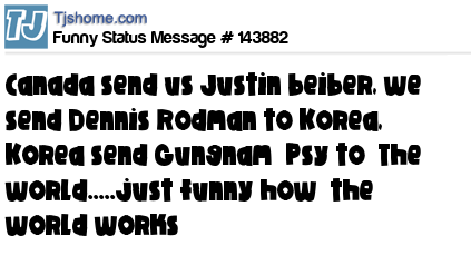 X says Canada send us Justin beiber, we send Dennis Rodman to Korea, Korea send Gungnam Psy to The world.....just funny how the world works