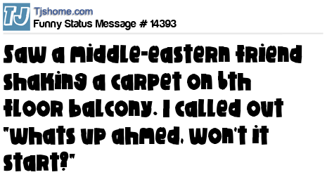 - # 144359 I just saw a Middle-Eastern guy vigorously shaking out a carpet off a 3rd floor balcony in my condo building. I yelled out, "WHAT UP, AKBAR? IT WON'T START?"