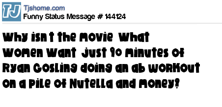 X says Why isn’t the movie ‘What Women Want’ just 90 minutes of Ryan Gosling doing an ab workout on a pile of Nutella and money?