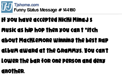 X says If you have accepted Nicki Minaj’s music as hip hop then you can’t *itch about Macklemore winning the best rap album award at the Grammys. You can't lower the bar for one person and deny another.