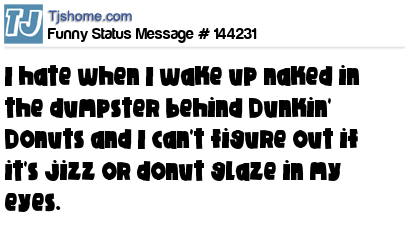 X says I hate when I wake up naked in the dumpster behind Dunkin' Donuts and I can't figure out if it's jizz or donut glaze in my eyes.