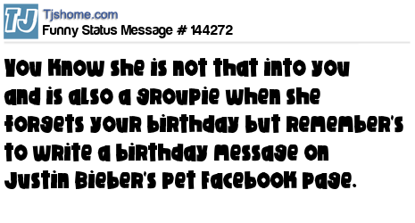 X says You know she is not that into you and is also a groupie when she forgets your birthday but remember's to write a birthday message on Justin Bieber's pet Facebook page.