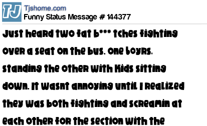 X Just heard two fat b*** tches fighting over a seat on the bus. one 60yrs, standing the other with kids sitting down. It wasnt annoying until I realized they was both fighting and screamin at each other for the section with the handicap seat! Thx Obamacare