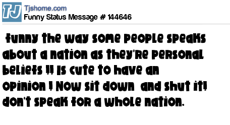 X says funny the way some people speaks about a nation as they're personal beliefs !! Is cute to have an opinion ! Now sit down and shut it! don't speak for a whole nation.