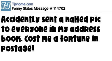 - # 198684 Yesterday I accidentally sent a naked picture of me to everyone in my address book. Not only was it embarrassing but it cost a fortune in stamps