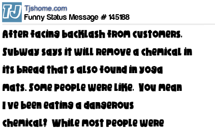 X says After facing backlash from customers, Subway says it will remove a chemical in its bread that’s also found in yoga mats. Some people were like, “You mean I’ve been eating a dangerous chemical?” While most people were like, “You mean I can eat my