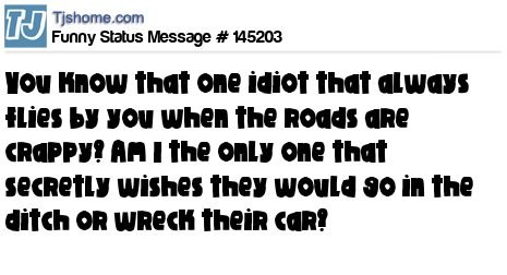 X You know that one idiot that always flies by you when the roads are crappy? Am I the only one that secretly wishes they would go in the ditch or wreck their car?