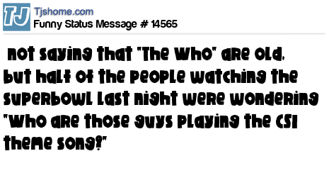 X is not saying that "The Who" are old, but half of the people watching the superbowl last night were wondering "Who are those guys playing the CSI theme song?"