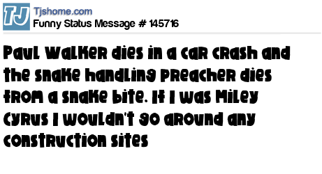X says Paul Walker dies in a car crash and the snake handling preacher dies from a snake bite. If I was Miley Cyrus I wouldn't go around any construction sites