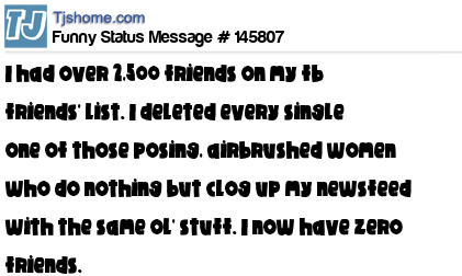 X I had over 2,500 friends on my fb friends' list. I deleted every single one of those posing, airbrushed women who do nothing but clog up my newsfeed with the same ol' stuff. I now have zero friends.