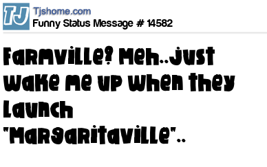 - # 18835 Farmville? Fishville? I want to play Margaritaville. All I need is: 1800 Tequila, a pop-top and a woman to blame. But if I don't get them, I know it is my own damn fault.
