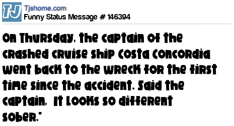 - # 87464 The captain of the Costa Concordia is maintaining he only abandoned ship before the passengers because he tripped and fell in to a life boat. I find this very feasible as I once accidently tripped and my pen!s fell in to my wife's sister.