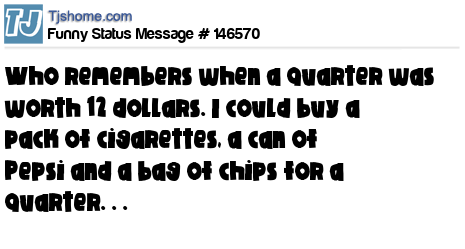 X says Who remembers when a quarter was worth 12 dollars. I could buy a pack of cigarettes, a can of Pepsi and a bag of chips for a quarter. . .