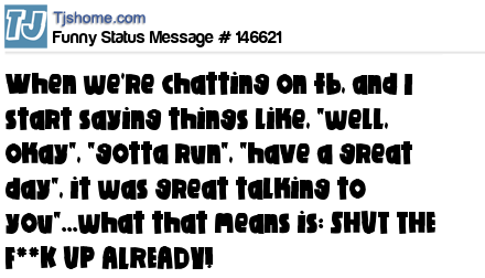X When we're chatting on fb, and I start saying things like, "well, okay", "gotta run", "have a great day", it was great talking to you"...what that means is: SHUT THE F**K UP ALREADY!