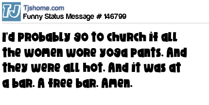 X says I'd probably go to church if all the women wore yoga pants. And they were all hot. And it was at a bar. A free bar. Amen.