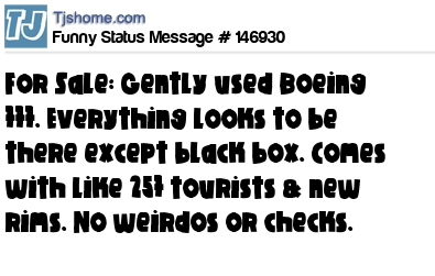 X For Sale: Gently used Boeing 777. Everything looks to be there except black box. Comes with like 257 tourists & new rims. No weirdos or checks.