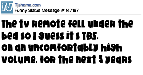 X says The tv remote fell under the bed so I guess it’s TBS, on an uncomfortably high volume, for the next 5 years
