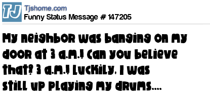 X says My neighbor was banging on my door at 3 a.m.! Can you believe that? 3 a.m.! Luckily, I was still up playing my drums....