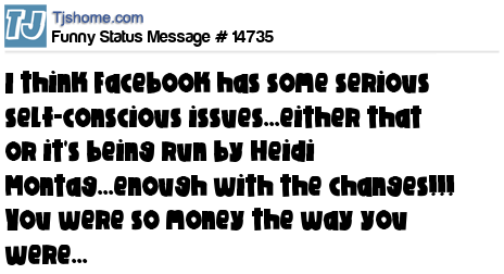 X says I think Facebook has some serious self-conscious issues...either that or it's being run by Heidi Montag...enough with the changes!!! You were so money the way you were...