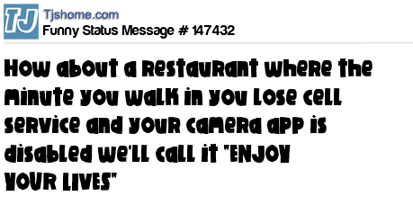 X says How about a restaurant where the minute you walk in you lose cell service and your camera app is disabled we'll call it "ENJOY YOUR LIVES"