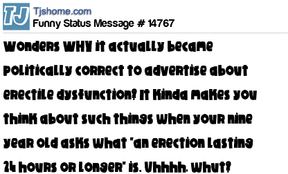 X is wonders WHY it actually became politically correct to advertise about erectile dysfunction? It kinda makes you think about such things when your nine year old asks what "an erection lasting 24 hours or longer" is. Uhhhh, whut?