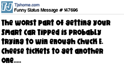X says The worst part of getting your Smart Car Tipped is probably trying to win enough Chuck E. Cheese tickets to get another one.....