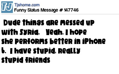 X says “Dude things are messed up with Syria.” “Yeah. I hope she performs better in iPhone 6.” I have stupid, really stupid friends