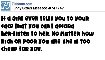 X says If a girl ever tells you to your face that you can’t afford her-listen to her. No matter how rich or poor you are, she is too cheap for you.