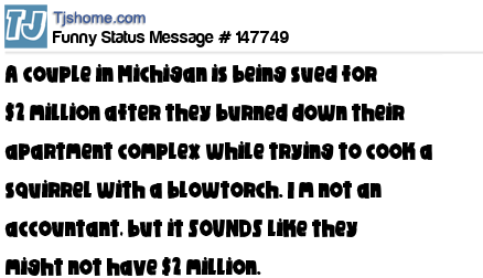 X says A couple in Michigan is being sued for $2 million after they burned down their apartment complex while trying to cook a squirrel with a blowtorch. I’m not an accountant, but it SOUNDS like they might not have $2 million.