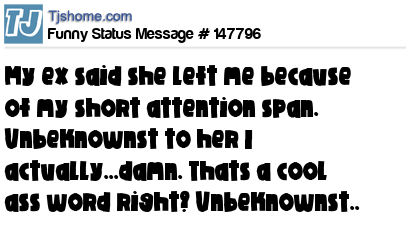 - # 123544 My ex said she left me because of my short attention span. Unbeknownst to her I actually…damn that’s a cool ass word right? Unbeknownst.