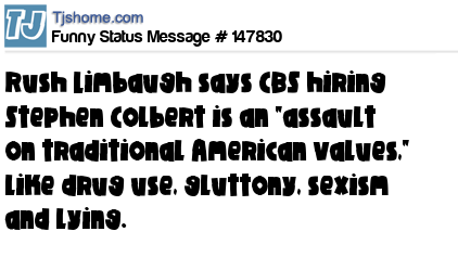 X says Rush Limbaugh says CBS hiring Stephen Colbert is an "assault on traditional American values," like drug use, gluttony, sexism and lying.