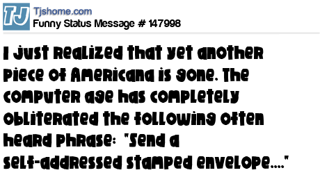 X I just realized that yet another piece of Americana is gone. The computer age has completely obliterated the following often heard phrase: "Send a self-addressed stamped envelope...."