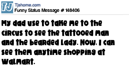 X says My dad use to take me to the circus to see the tattooed man and the bearded lady. Now, I can see them anytime shopping at Walmart.