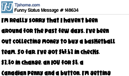 X I'm really sorry that I haven't been around for the past few days. I've been out collecting money to buy a basketball team. So far, I've got $47.62 in checks, $2.50 in change, an IOU for $5, a Canadian penny and a button. I'm getting really excited