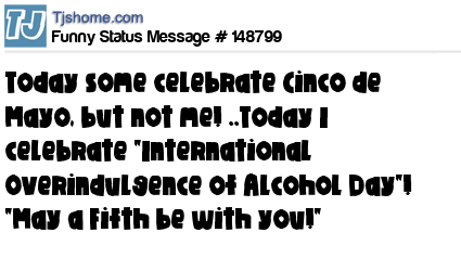 X Today some celebrate Cinco de Mayo, but not me! ..Today I celebrate "International Overindulgence of Alcohol Day"! "May a Fifth be with you!"
