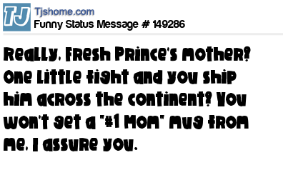 X says Really, Fresh Prince's mother? One little fight and you ship him across the continent? You won't get a "#1 Mom" mug from me, I assure you.