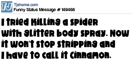 - # 197240 Great... I tried to kill a spider with glitter body spray and it didn't work Now I have a spider that won't stop dancing and insists I call her cinnamon