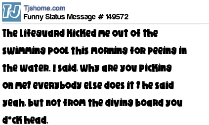 X says The lifeguard kicked me out of the swimming pool this morning for peeing in the water. I said, why are you picking on me? everybody else does it ? he said yeah, but not from the diving board you d*ck head.