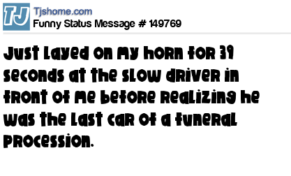 X says Just layed on my horn for 39 seconds at the slow driver in front of me before realizing he was the last car of a funeral procession.