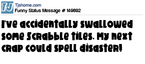 - # 178498 I accidentally swallowed a bunch of Scrabble tiles. My next trip to the bathroom could spell disaster.