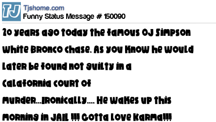 X says 20 years ago today the famous OJ Simpson white Bronco chase. As you know he would later be found not guilty in a Calafornia court of murder...Ironically.... He wakes up this morning in JAIL !!! Gotta love Karma!!!