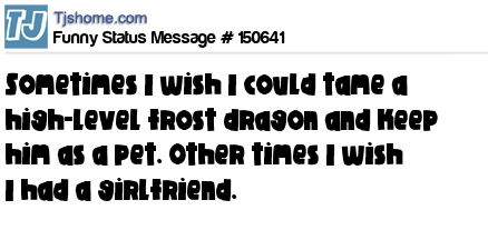 X says Sometimes I wish I could tame a high-level frost dragon and keep him as a pet. Other times I wish I had a girlfriend.