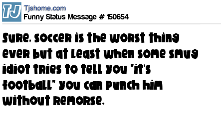 X says Sure, soccer is the worst thing ever but at least when some smug idiot tries to tell you "it's football" you can punch him without remorse.