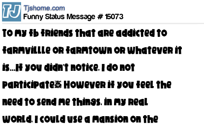 X says To my fb friends that are addicted to farmvillle or farmtown or whatever it is...If you didn't notice, I do not participate~ However if you feel the need to send me things, in my real world, I could use a mansion on the beach with 3 maids, 1 cook, at leas